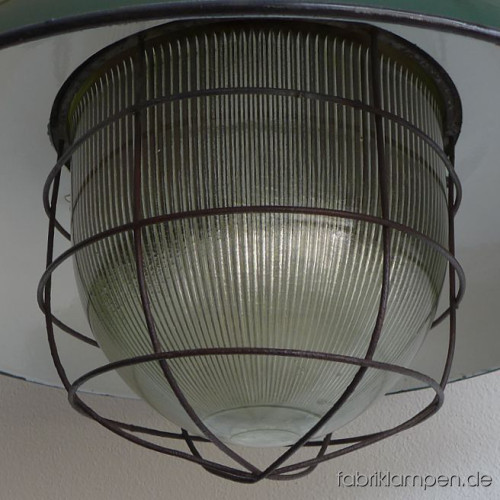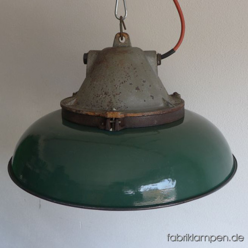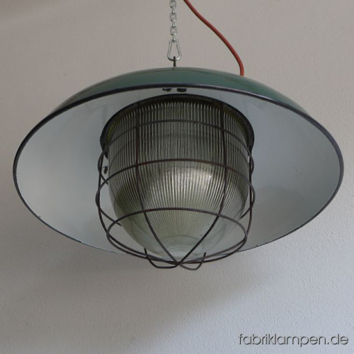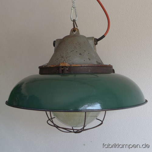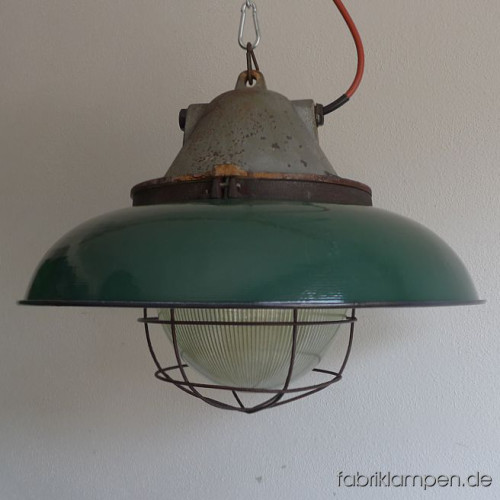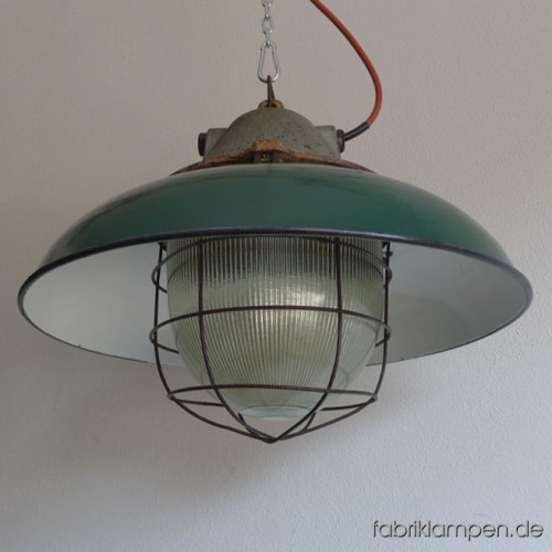 Very rare big bunker lamp with green enamel shades. It belongs to the biggest coloured enamel lamps, the diameter of the shade is 52 cm (20,5 inches), the lamp weighs 15 kgs. The lamps have the traces of age and usage. Material: casted iron top, safety glass and grid, green (inside white) enameled steel sheet. Cleaned, conserved and newly electrified, with E27 ceramic bulbholders.