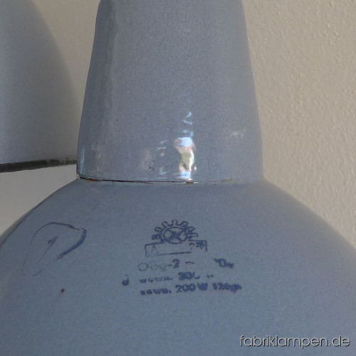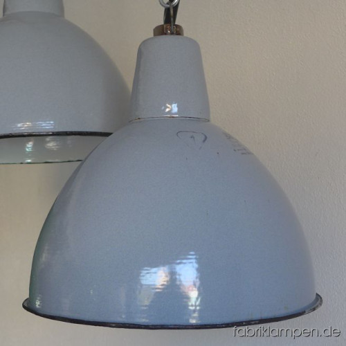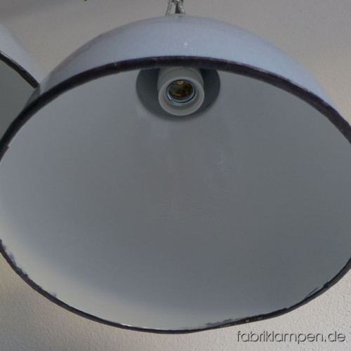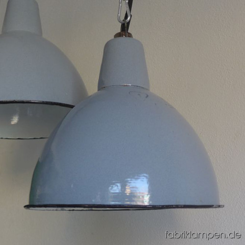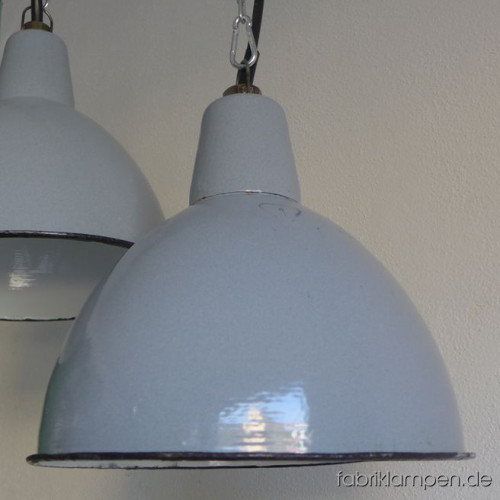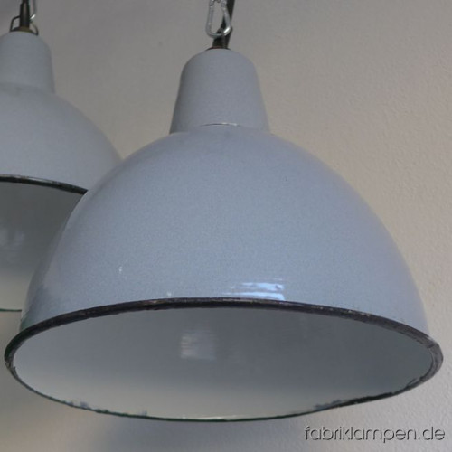 Rare old pale gray enamel lamp. The lamps have the traces of usage and age. Material: pale gray (inside white) enameled steel sheet. Clenad and newly electrified, with E27 ceramic sockets. We have only 2 pieces in stock. Height of the lamps ca. 23 cm (9 inches), diameter of the shades ca. 31 cm (12,2 inches).