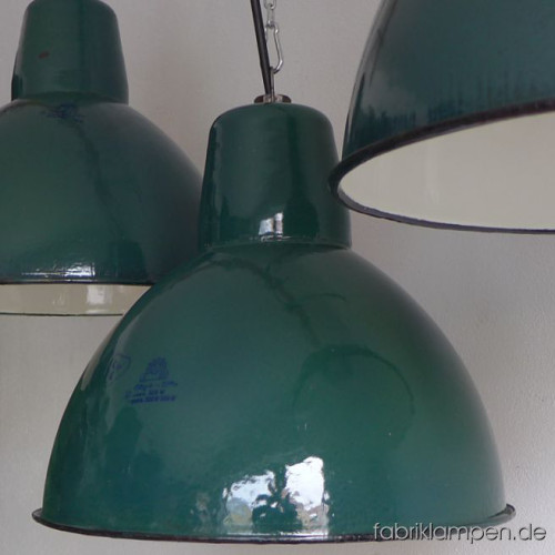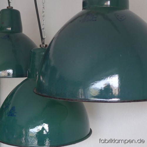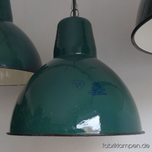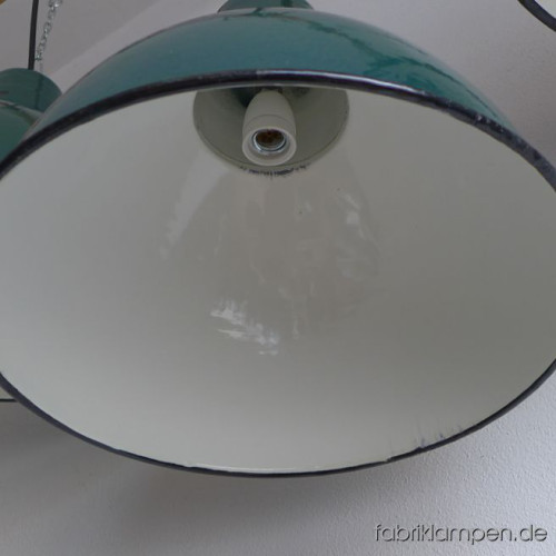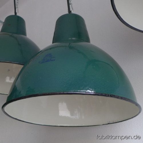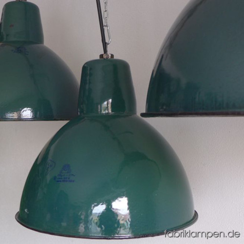 Rare old green enamel lamp. These lamps belong to the biggest old green enamel lamps ever. The old factory lamps have the traces of usage and age. Material: green (inside white) enameled steel sheet. Clenad and newly electrified, with E27 ceramic bulbholders. Height of the lamps ca. 37 cm (10,6 inches), diameter of the shades ca. 42 cm (16,5 inches).