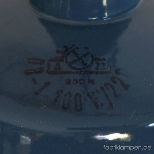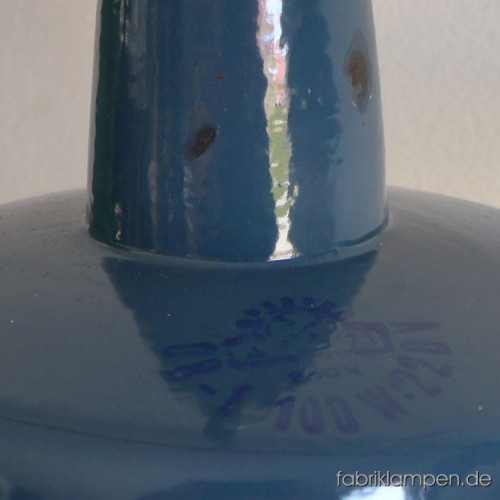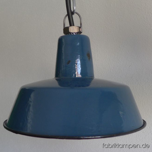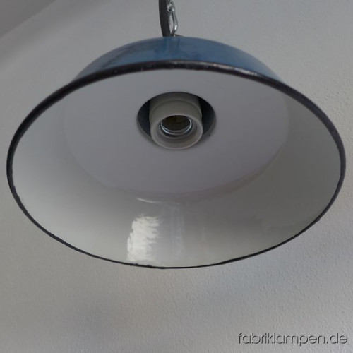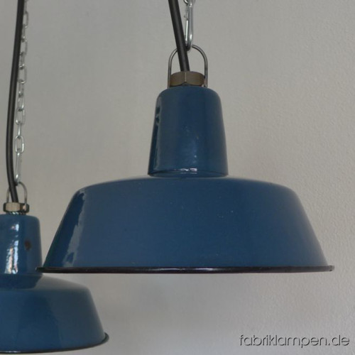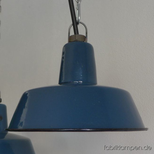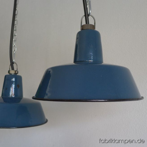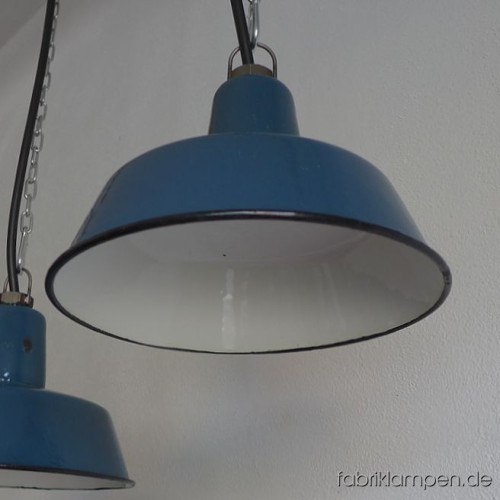 Rare old blue enamel industrial lamps. The old factory lamps have the traces of usage and age. Material: pale blue (inside white) enameled steel sheet, hallmarked. Cleaned and newly electrified, with E27 ceramic bulbholders. Height of the lamps ca. 13 cm (5,1 inches), diameter of the shades ca. 25 cm (9,8 inches).