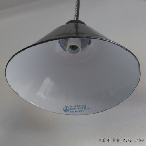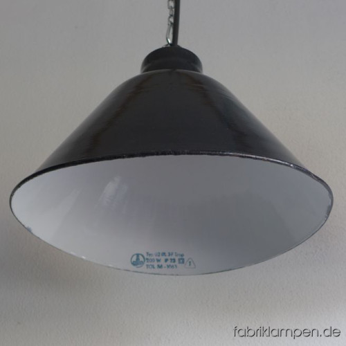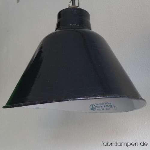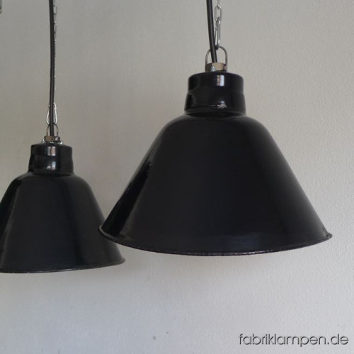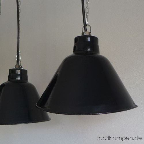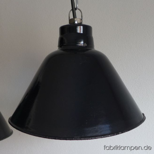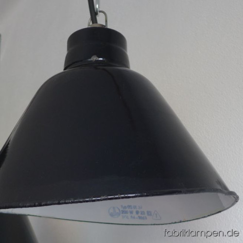 Old black industrial lamp, produced by LBL, VEB Leuchtenbau Leipzig, GDR. The asymmetric shades are elegant and functional over a long table, sideboard, bar or counter. The lamps have the typical traces of usage and age. Material: black (inside white) enameled steel sheet. Newly electrified, with E27 ceramic bulb sockets. Height of the lamp ca. 25 cm (9,8 inches), width of the shade ca. 35 cm (13,8 inches), depth of the shade ca. 26 cm (10,2 inches). The lamps can be shipped also with steel-tube suspension or textile cable (surcharge).