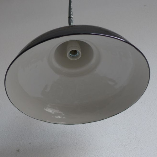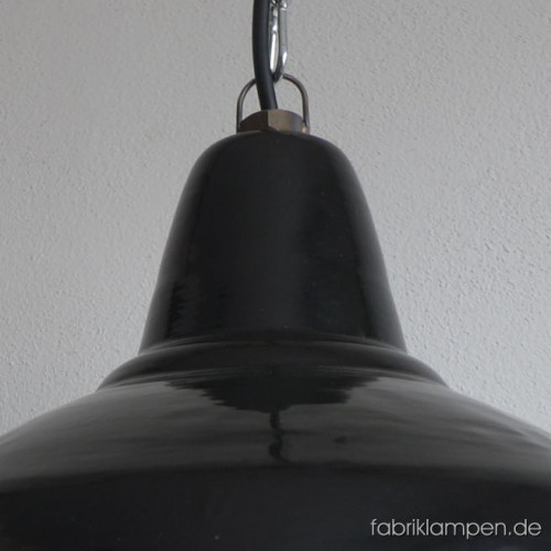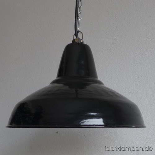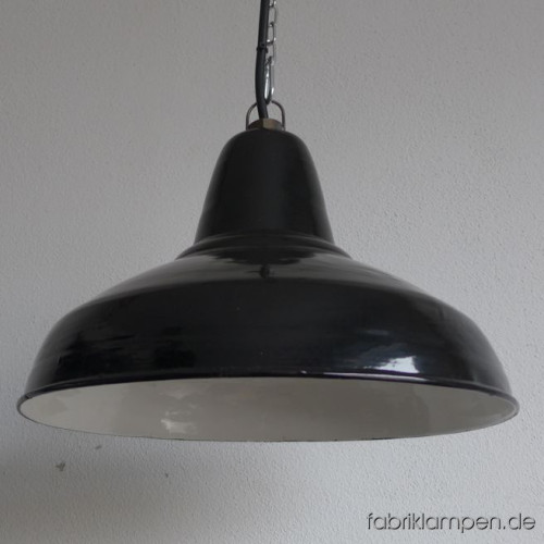 Very rare old black enamel lamp from the 1930ies. Material: black (inside white) enameled steel sheet. With light traces of age and usage, good condition. Cleaned, newly electrified, with E27 ceramic socket. Height of the lamp ca. 26 cm (10,2 1inches), diameter of the shade ca. 41 cm (16,1 inches). The lamp will be shipped with 2 m cable and suspension eye (chain or steel-tube suspension is possible for an additional charge).