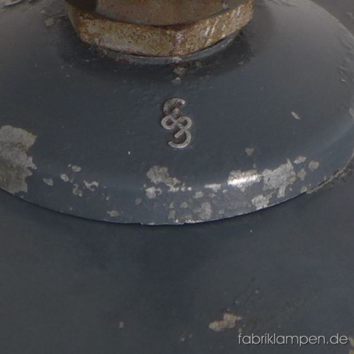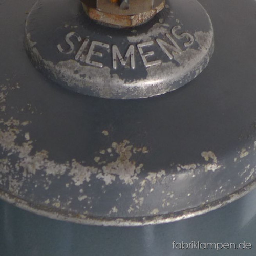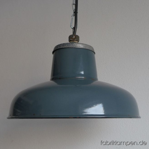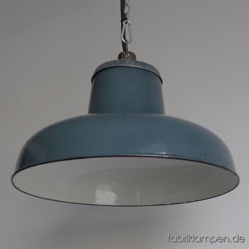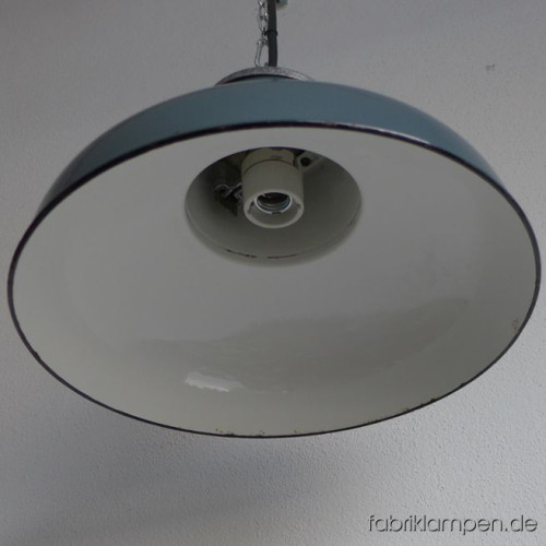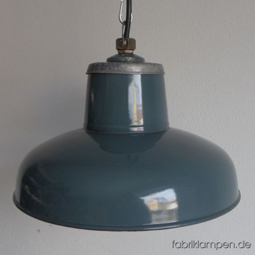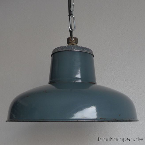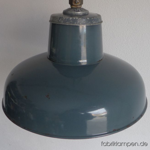 Old enamel factory lamp with enamel shade and aluminium top, hallmarked. Made in West-Germany. Material: bluish gray (inside white) enameled steel sheet, aluminium head. With light traces of age and usage. Cleaned, newly electrified, with E27 ceramic socket. Height of the lamp ca. 23 cm (9 inches), diameter of the shades ca. 39 cm (15,4 inches). The lamp will be shipped with 2 m cable and hanging eye. Chain suspension is possible for an additional charge.