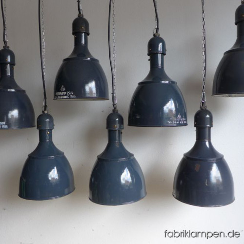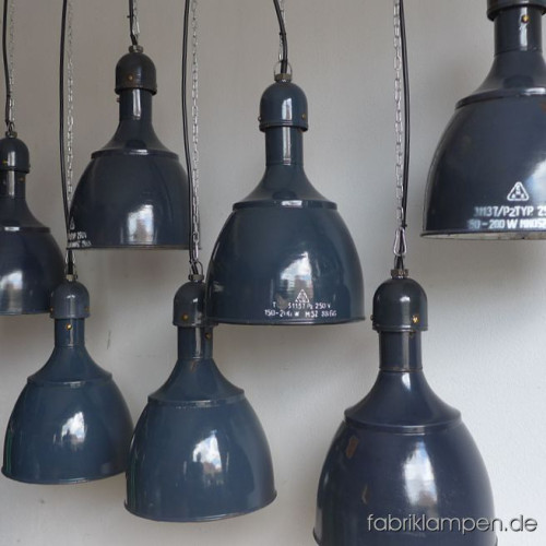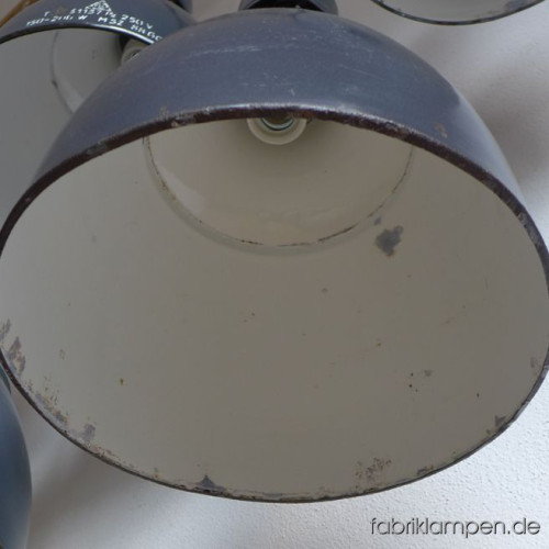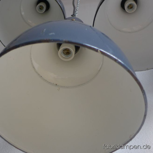 These old lamps have strong traces of usage and age. Material: grayish blue (inside white) enameled steel sheet. Newly electrified, with E27 ceramic sockets.