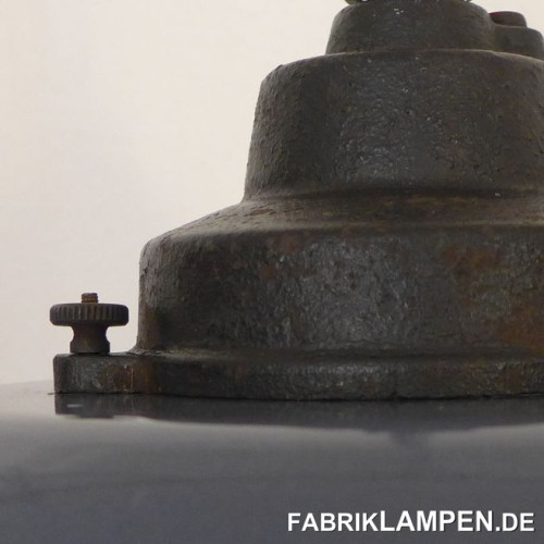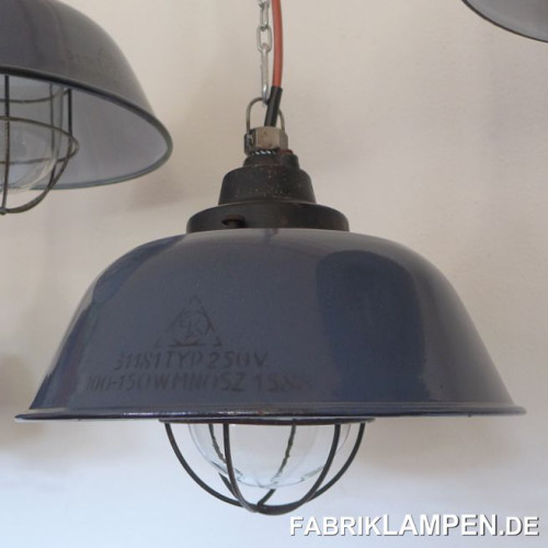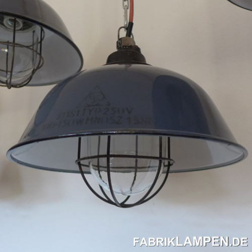 Old dark blue factory lamp with casted iron top and enamel shade, hallmarked, from the 1940s.
