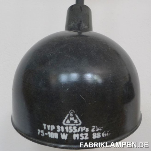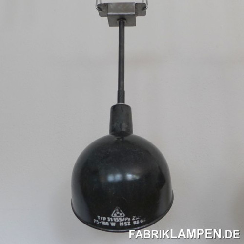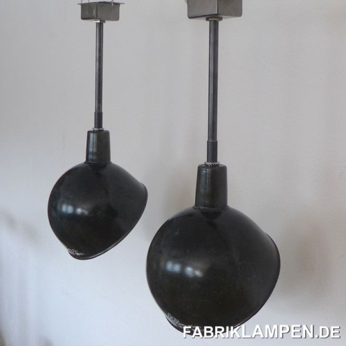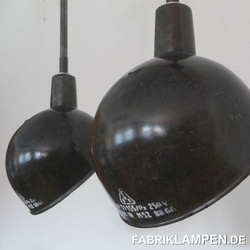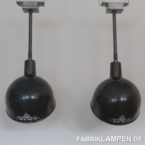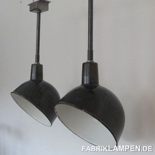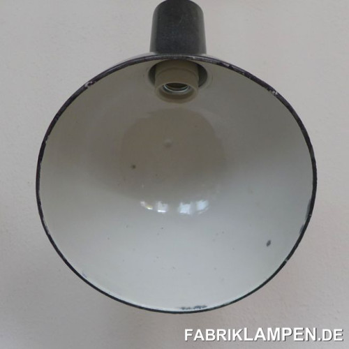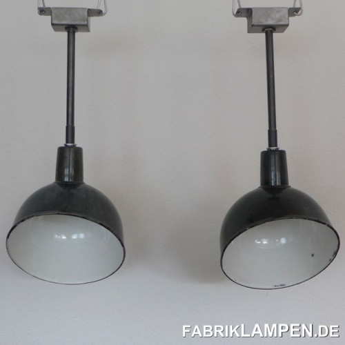 Material: black/anthrazite (inside white) enameled steel sheet. Cleaned and conserved, newly electrified, with E27 ceramic sockets. Suspension: steel-tube suspension and canopy.