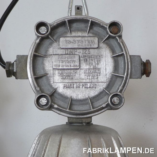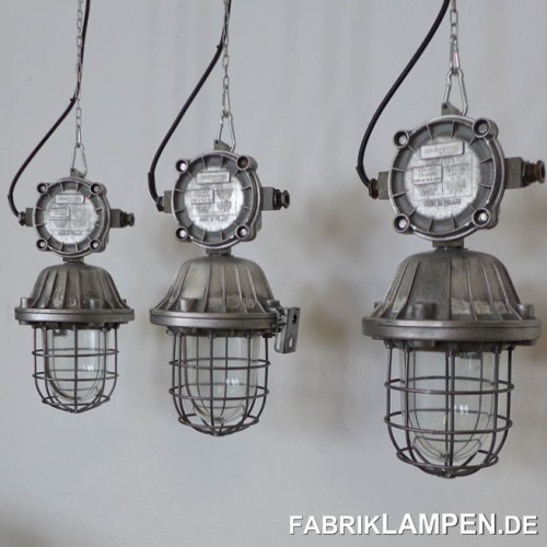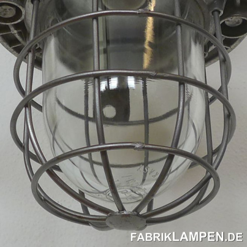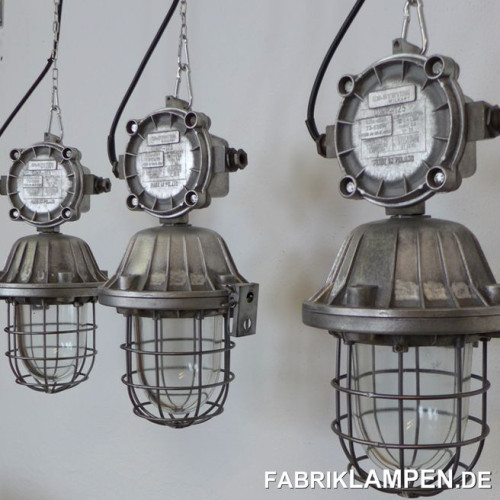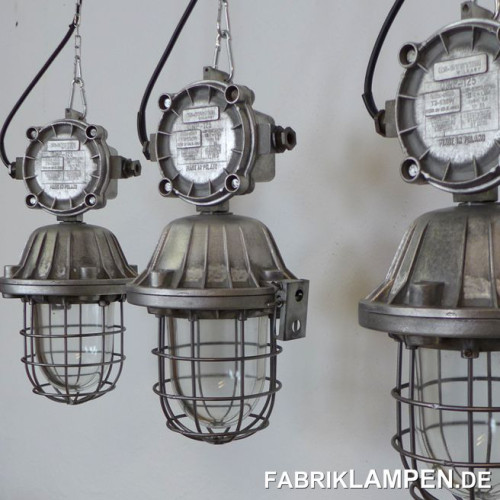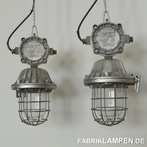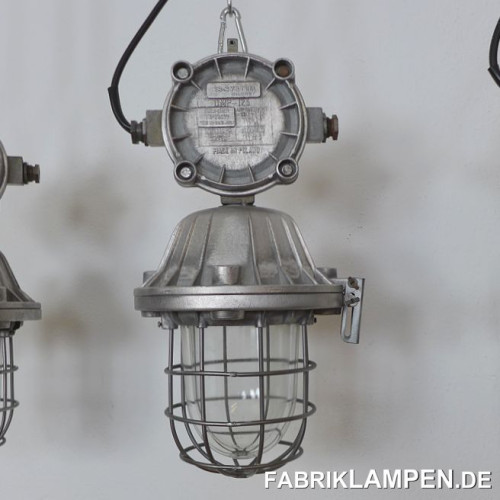Old bunker lamp with distribution box. The lamps are in good condition and have only moderate traces of usage and age. Material: aluminium casing, safety glass and steel grid.