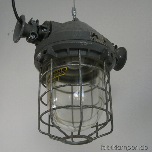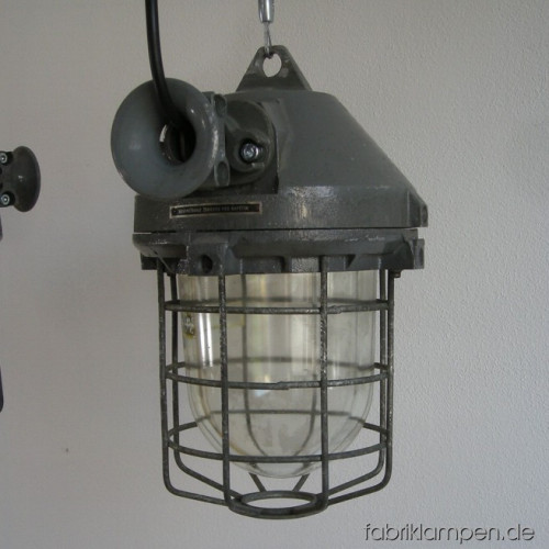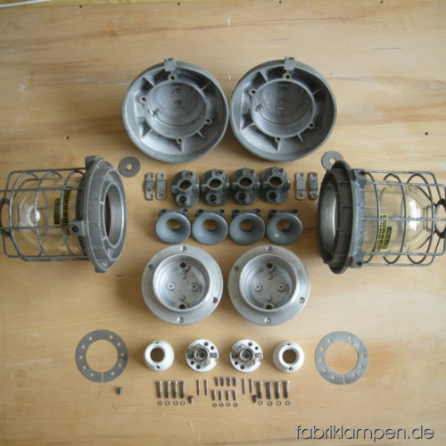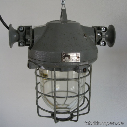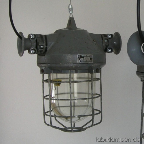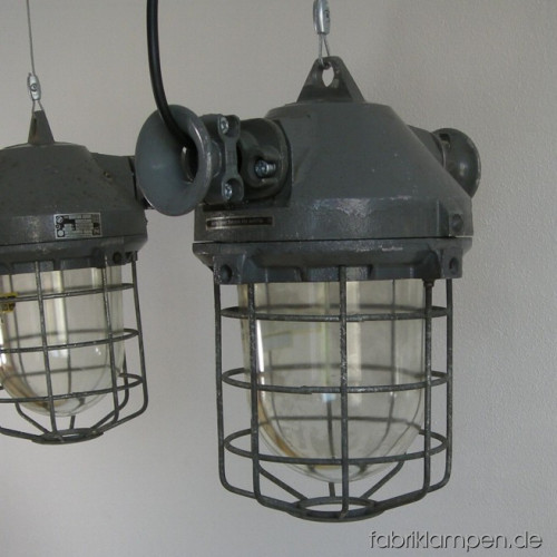 Nice industrial bunker lamps. Material: aluminium, steel, glass. The lamps are cleaned, and newly electrified, with ca. 2 m wire. Total height: ca. 38 cm (15 inches), weight ca. 8 kgs.