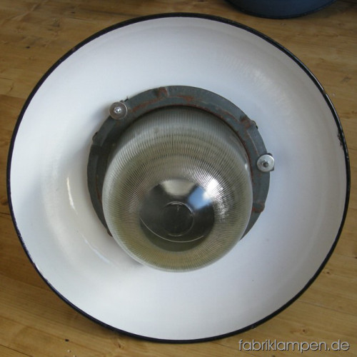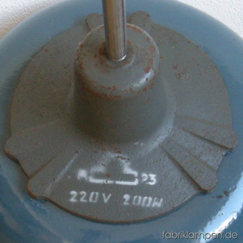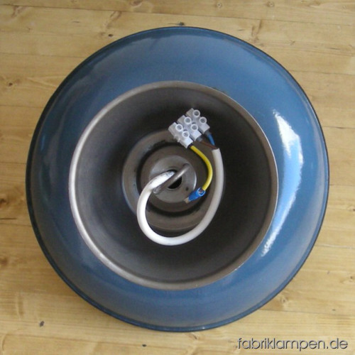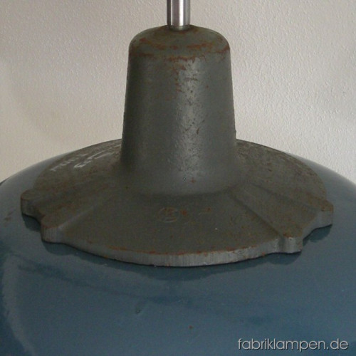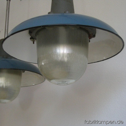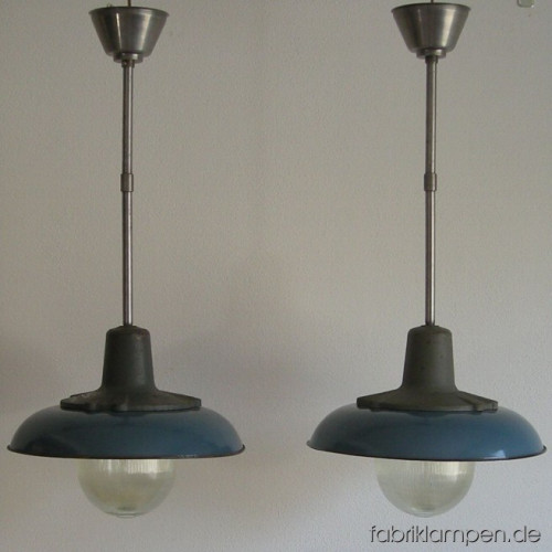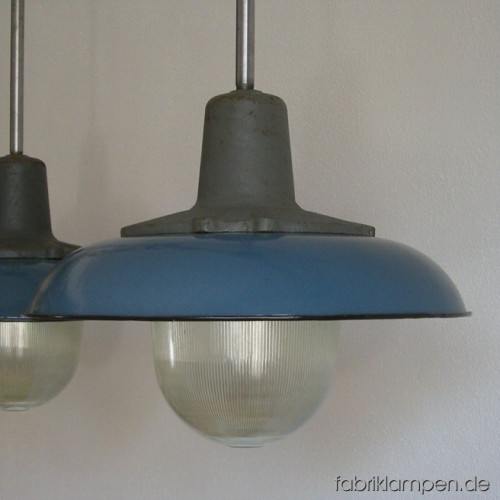 Industrial lamps with blue enamel shades and safety glasses. Material: casted iron, steel, glass and blue enameled sheet. Newly electrified, with steel suspension. Height of the lamps ca. 34 cm (13,4 inches), diameter of the shades ca. 42 cm (16,5 inches), total height with suspension 65 or 86 cm (33,9 – 25,6 inches).