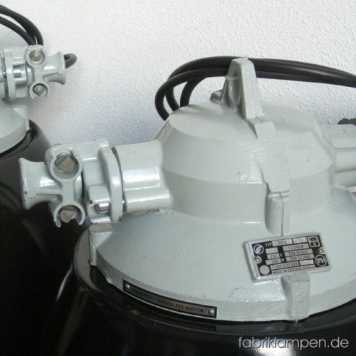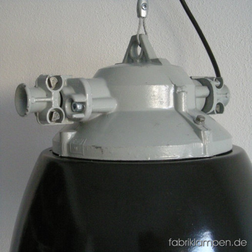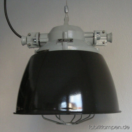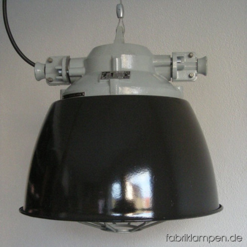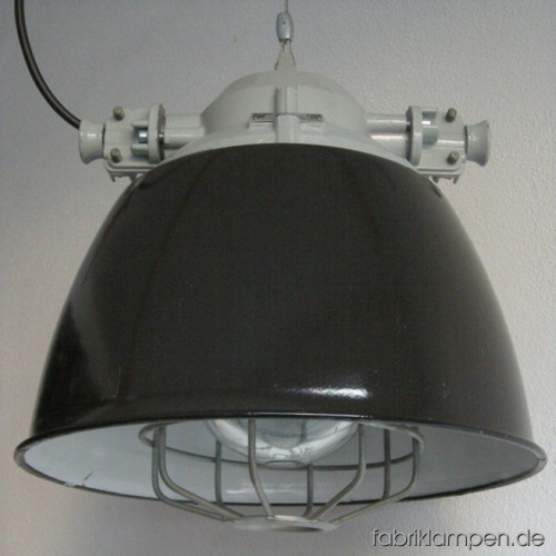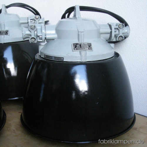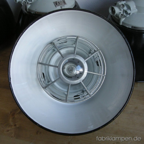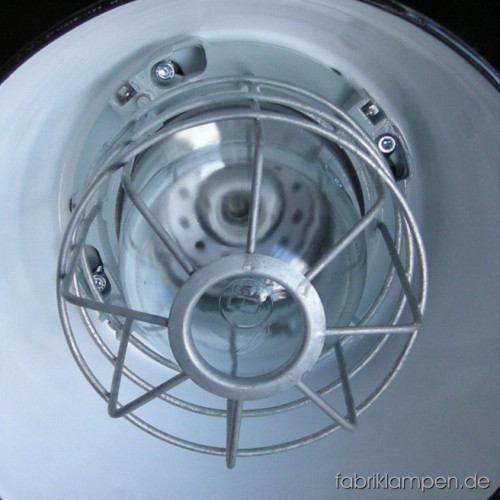 Rare black industrial lamp with enameled shades. The lamps have the traces of age and usage. Material: black (inside white) enameled sheet, aluminium head, safatey glass and grid. Cleaned, conserved and newly electrified, with E27 sockets. We have 5 pieces on stock. Height of the lamps ca. 39 cm (15,4 inches), diameter of the shades ca. 39 cm (15,4 inches).