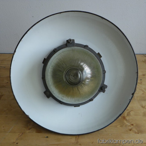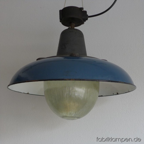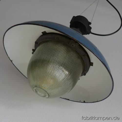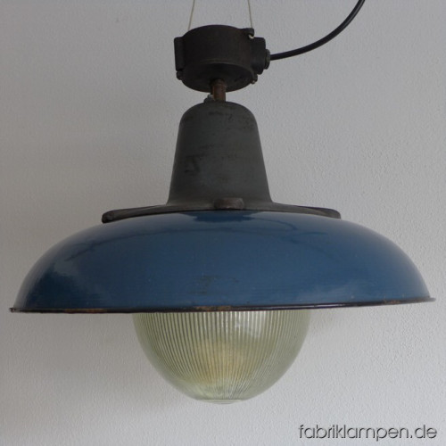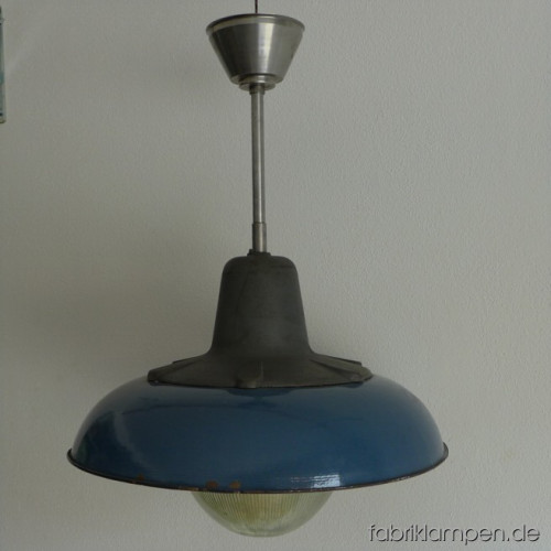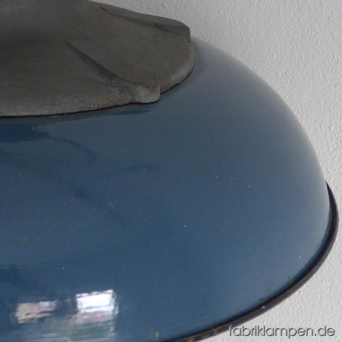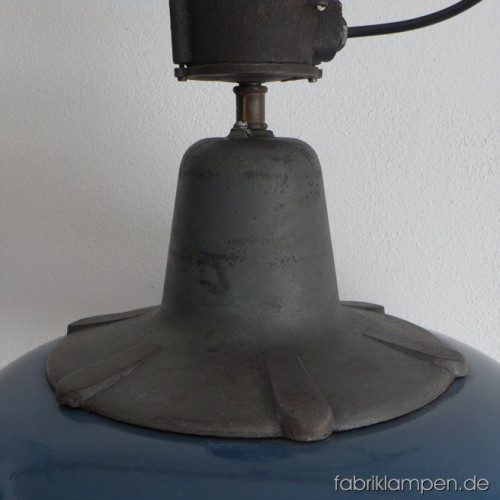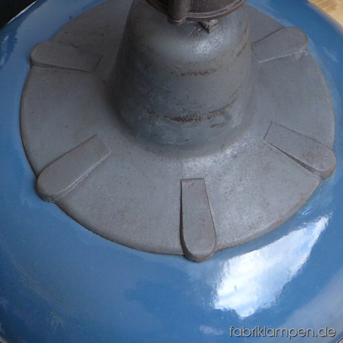 Very rare grave blue enamel lamp with casted iron top and massive glass bulb. It belongs to the biggest coloured enamel lamps, the diameter of the shade is 52 cm (20,5 inches), the lamp weighs 15 kgs. The lamp can be delivered either with the original distribution box (casted iron) or with tube-suspension with canopy. The lamps have the traces of age and usage. Cleaned, conserved, newly electrified, with E27 ceramic bulbholders.