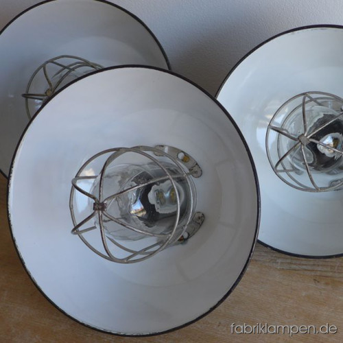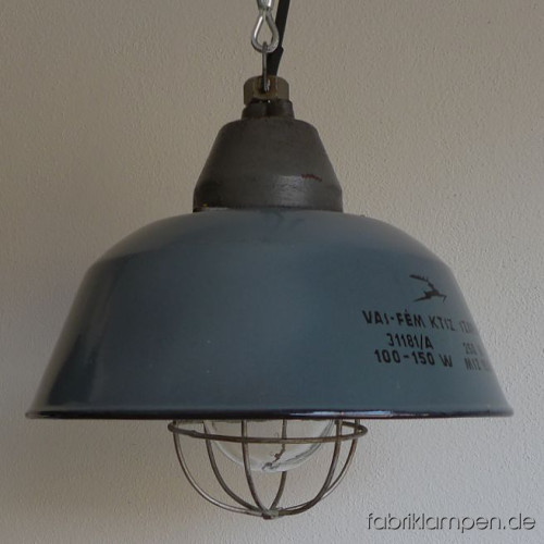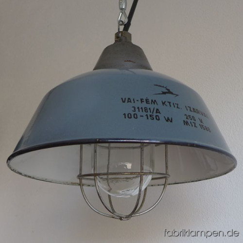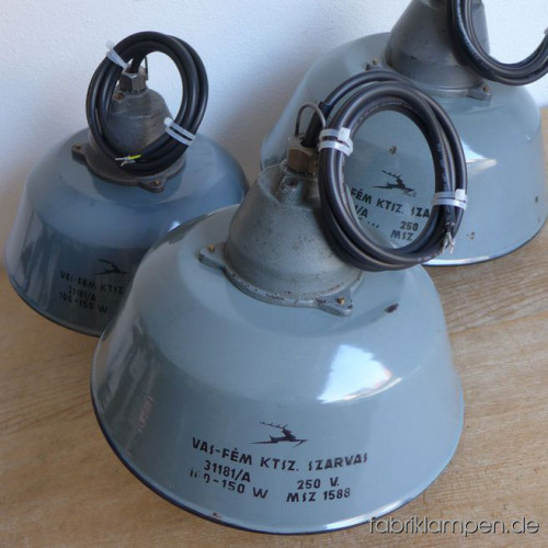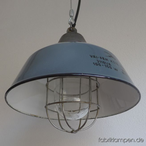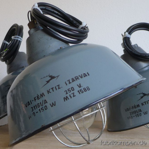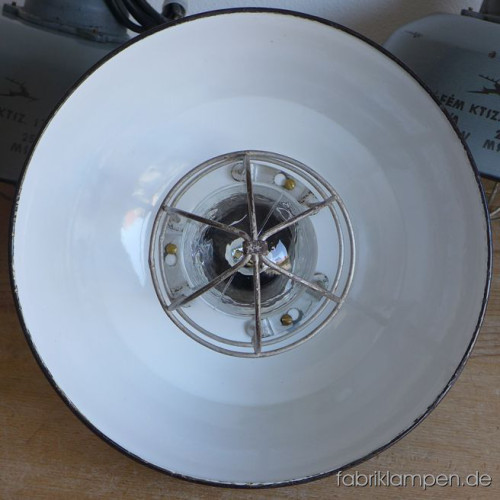 Old industrial lamp with gray (grayish blue) enameled shades. Material: gray enameled sheet, casted iron head, safety glass and steel grid. Newly electrified, with E27 sockets. We have 20 pieces on stock. Height of the lamps ca. 30,5 cm (12 inches), diameter of the shades ca. 36 cm (14,2 inches).