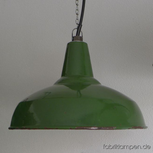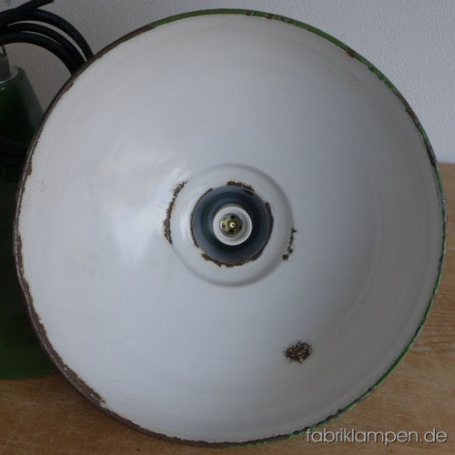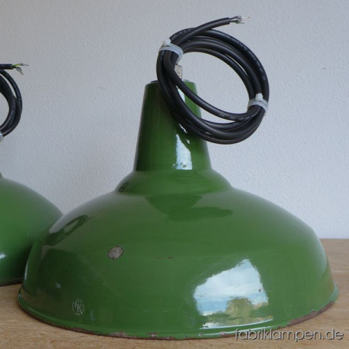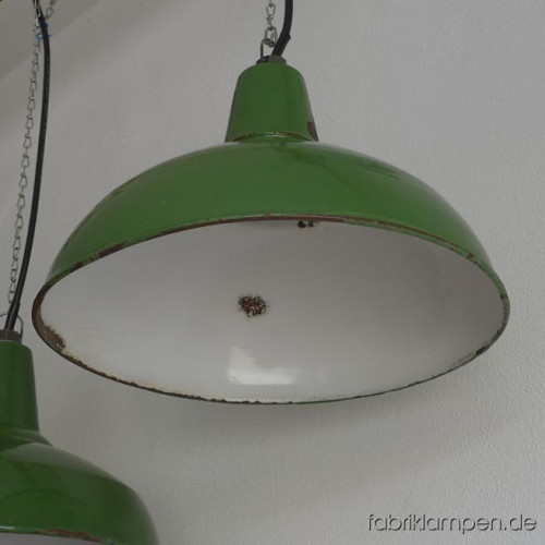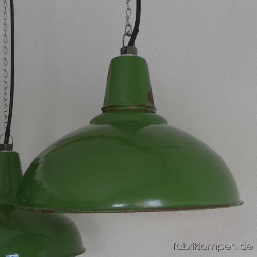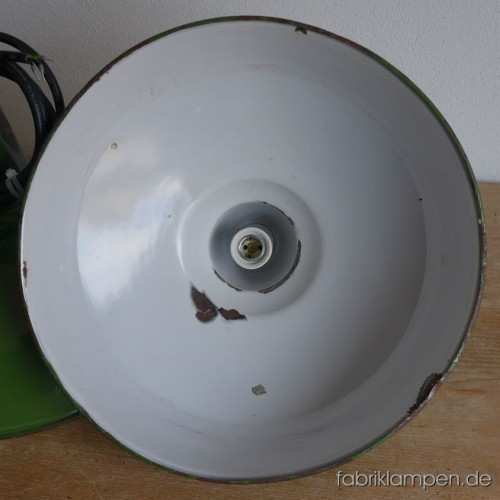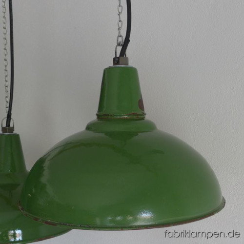 Old green enamel Art Deco factory lamps from about 1930, producer Karl Engel, Budapest. The lamps have the strong traces of usage and age. Material: black (inside white) enameled steel sheet. Newly electrified, with E27 ceramic sockets. Height of the lamps ca. 27 cm (10,6 inches), diameter of the shades ca. 41 cm (16,1 inches).