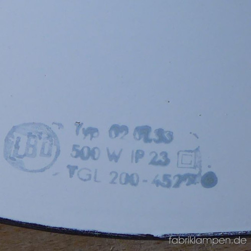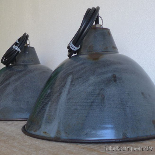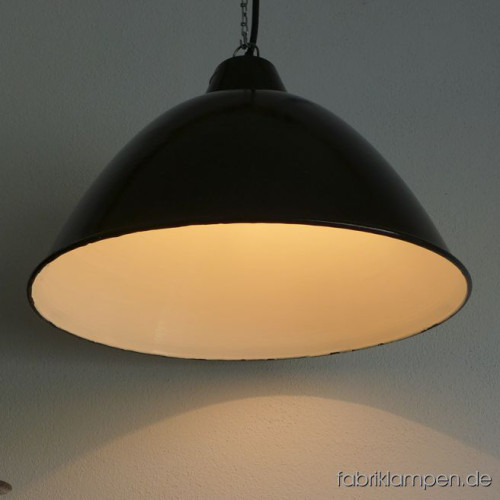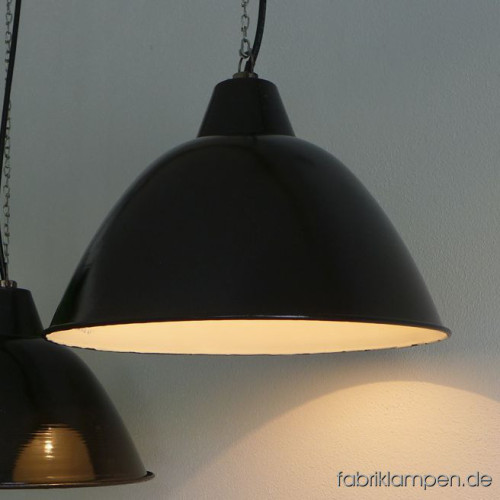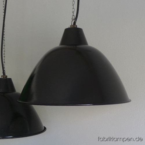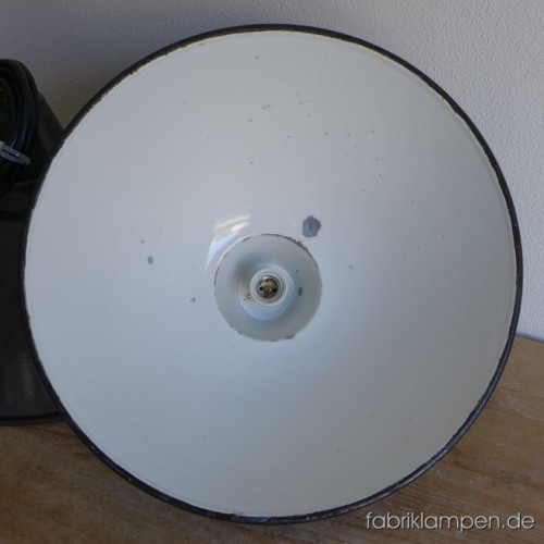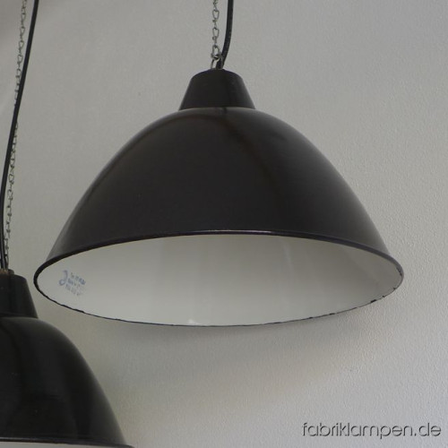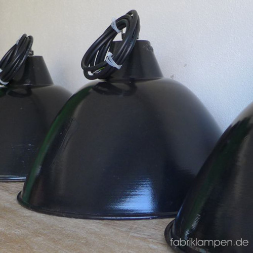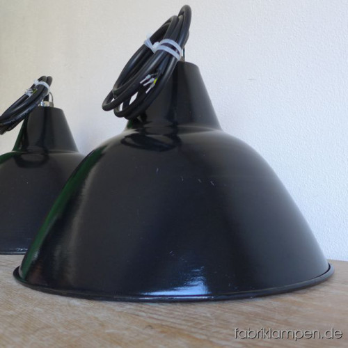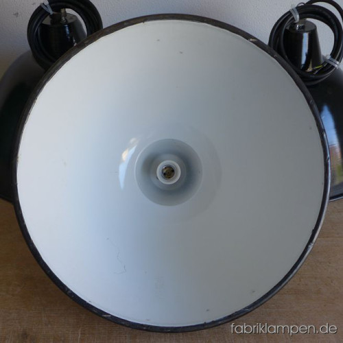 Old black enamel factory LBD lamp, producer LBD (VEB Leuchtenbau Dresden). We have always 20-30 pieces in stock. The lamps have the typical traces of usage and age. Material: black (inside white) enameled steel sheet. Newly electrified, with E27 ceramic sockets. Height of the lamps ca. 30 cm (11,8 inches), diameter of the shades ca. 46 cm (18,1 inches) – we have also the smaller version of this type in stock.