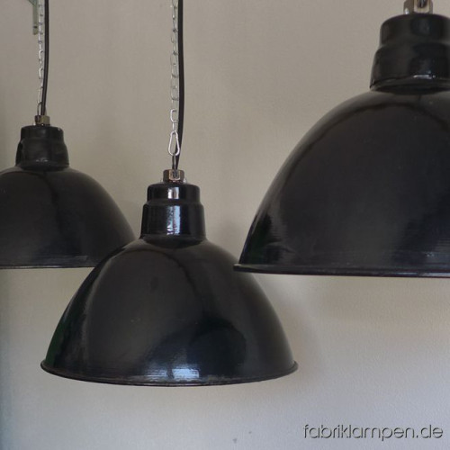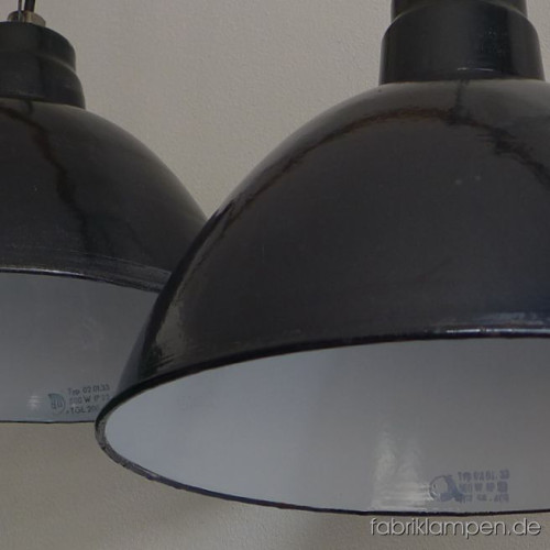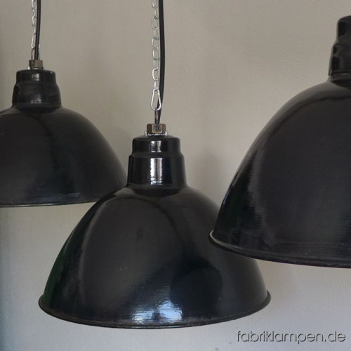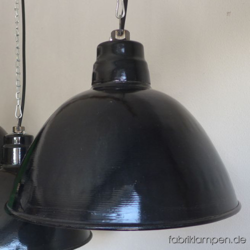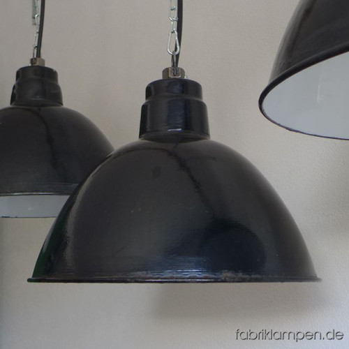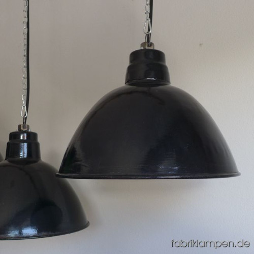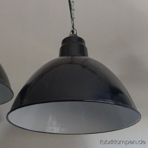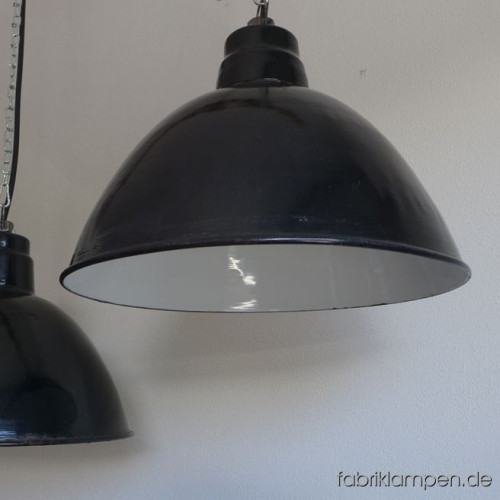 Old black enamel LBD loft lamp, produced by Leuchtenbau Dresden. The lamps have the typical traces of usage and age. Material: black (inside white) enameled steel sheet. Newly electrified, with E27 ceramic sockets. Height of the lamp ca. 29 cm (11,4 inches), diameter of the shade ca. 42 cm (16,5 inches).