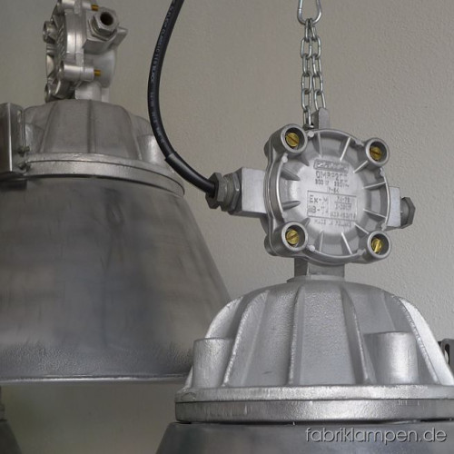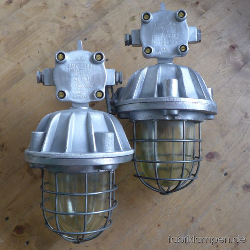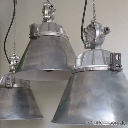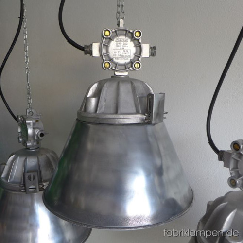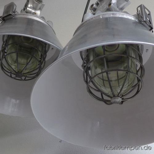 Big aluminium industrial lamps with safety glass and grid & shade. Material: aluminium, safety glass and steel grid. Cleaned, preserved, shades inside white varnished, newly electrified, with E27 sockets – we recommend LED bulbs for the lamps. We have 20 pieces on stock. Height of the lamps ca. 52 cm (20,5 inches), diameter of the shades ca. 46 cm (18,1 inches), weight ca. 10 kgs. The lamps can be used without the shade too, like a simple bully (height 46 cm, diameter 26 cm, last picture).