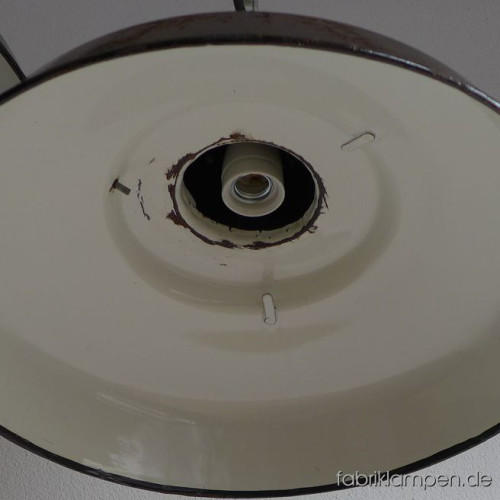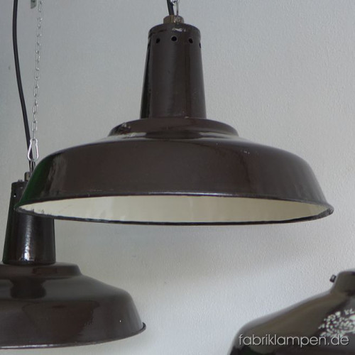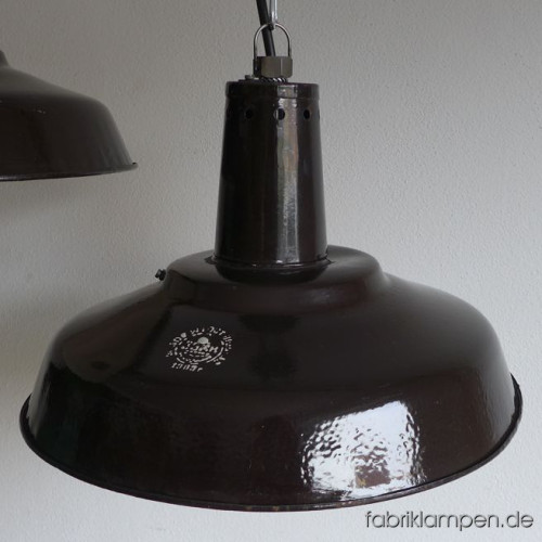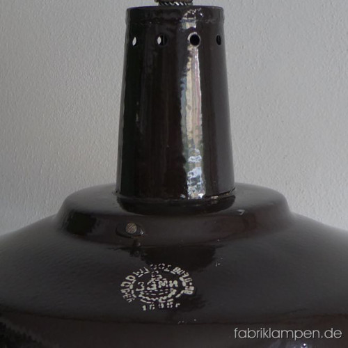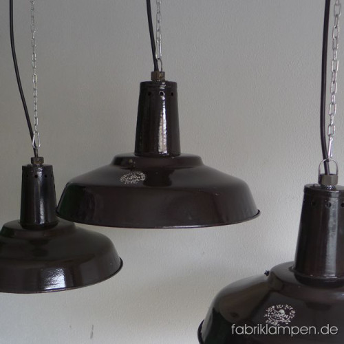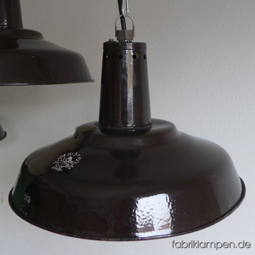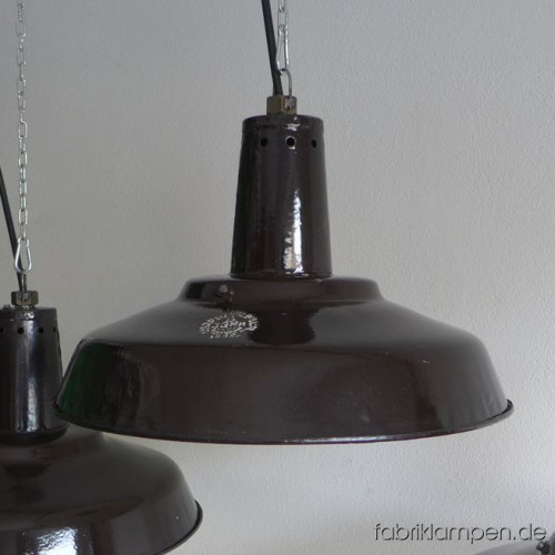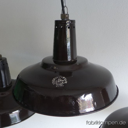 Old black enamel industrial lamps with hallmark. The lamps have the strong traces of usage and age. Material: green (inside white) enameled steel sheet. The neck is perforated (for ventilation/cooling), inside with holders (for glass – the lamps well be shipped without glass). Newly electrified, with E27 ceramic sockets. We have 15 pieces on stock. Height of the lamps ca. 30 cm (11,8 inches), diameter of the shades ca. 46 cm (18,1 inches). We have also the smaller version in stock: diameter 39 cm (15,3 inches), height 24 cm (9,4 inches).