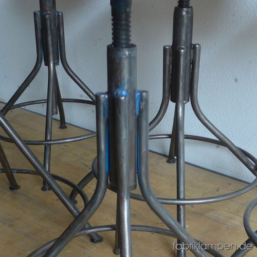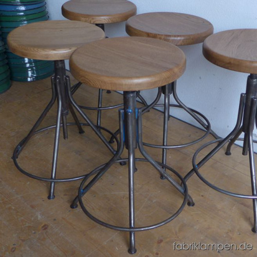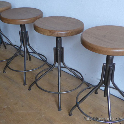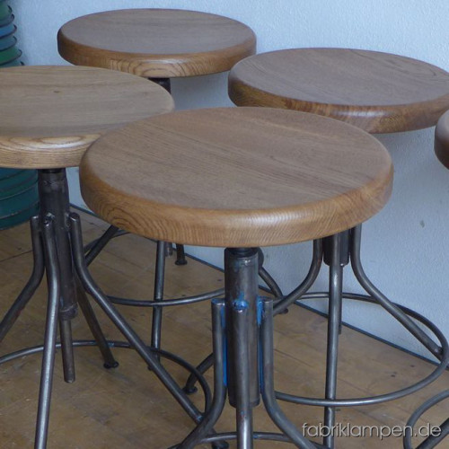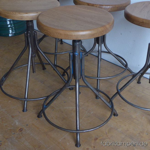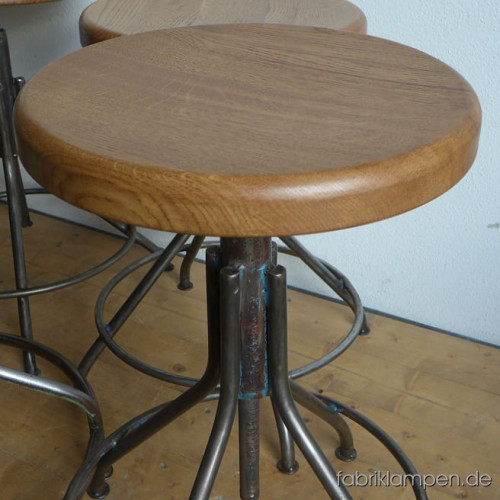 Very nice old industrial stools with oak sits. The pedestals are cleaned and conserved (here and there with remains of original colour like blue or green). These old stools became new oak sits, they are waxed. The oak massive sits are 3,8 cm (1,5 inches) thick, their diameter amount to 35 cm (13,8 inches). Everlasting, suitable for gastronomy or for your loft-kitchen.