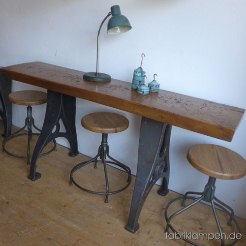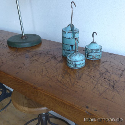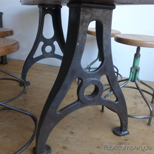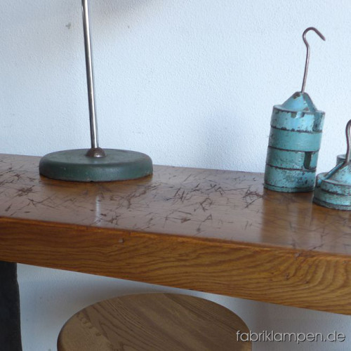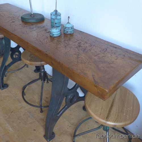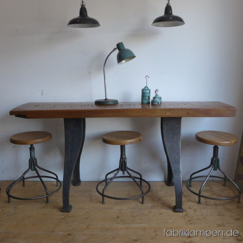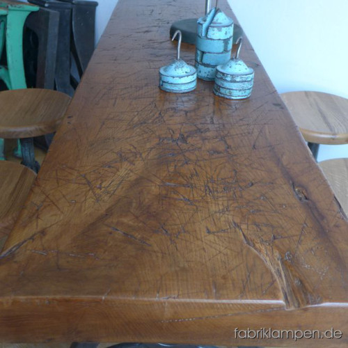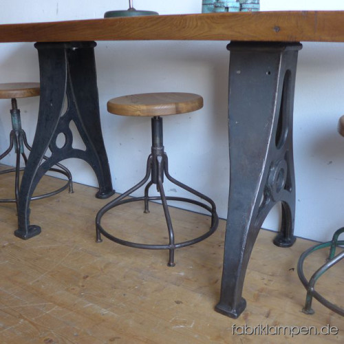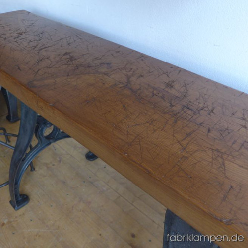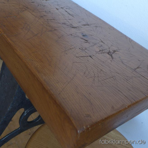 Old industrial table (workbench), restored. The casted iron pedestals are cleaned and waxed. Very fat and heavy tabletop (ash massiv, made of one piece of wood) with nice traces of use on the surface. Perfectly cleaned and waxed.