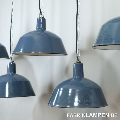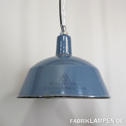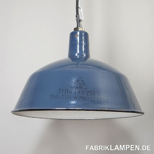 Material: grayish blue (inside white) enameled steel sheet. We have these lamps also in other shades, from light blue to dark blue. From this family of lamps we also have in stock some quite rare light gray copies, as well as the black/anthracite version (on request). These old industrial lights also exist with white lettering, we also have this version in stock.