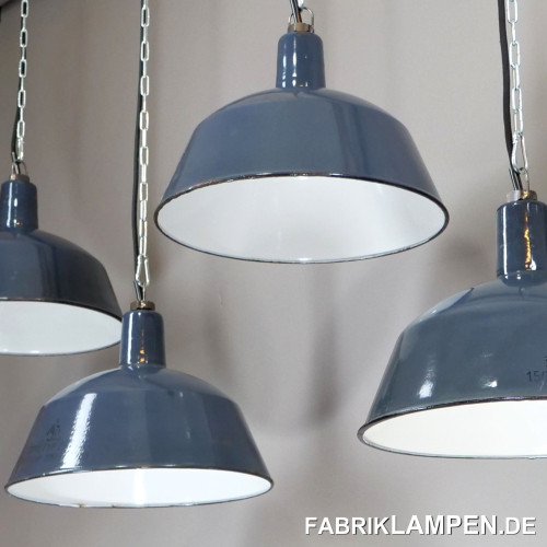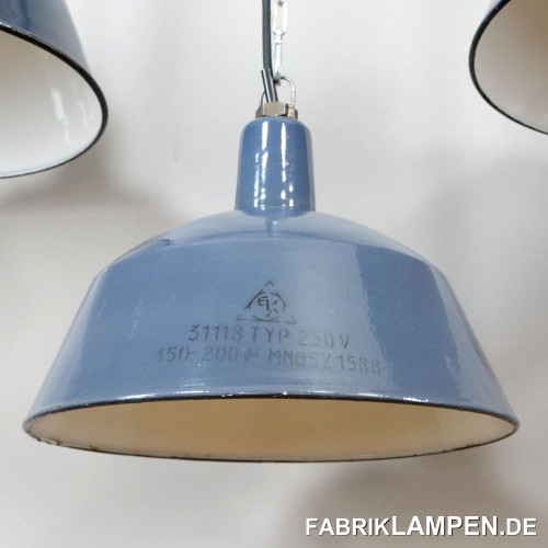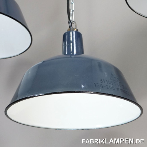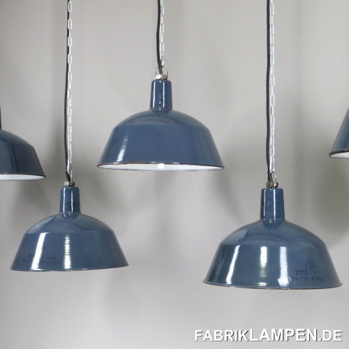 Old enamel industrial lamps in grayish blue with manufacturer’s mark.