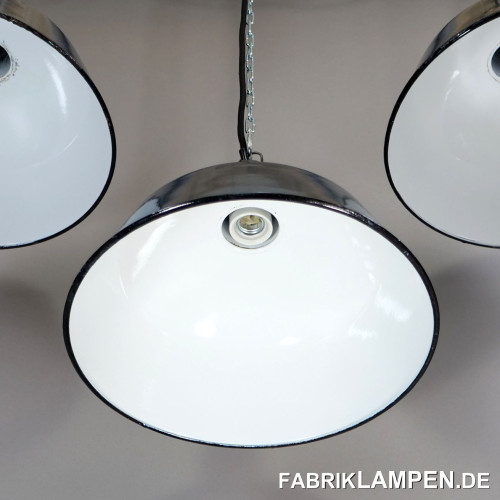 The old industrial lamps are supplied with a 2 meter textile cable in the color of your choice (other lengths are of course possible) and a massive hanging eye for safe hanging. The lamps can also be supplied with chain or tubular steel suspension for an additional charge. We can also offer canopies.