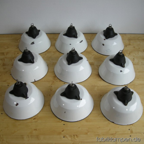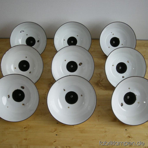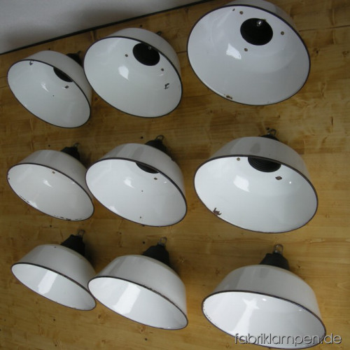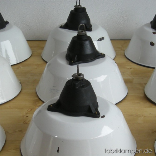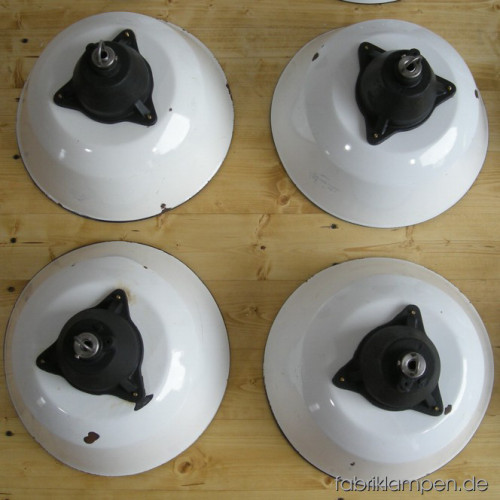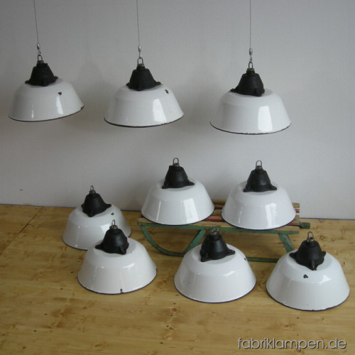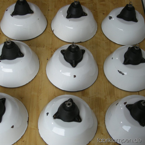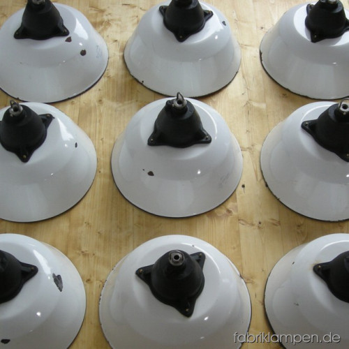 Nice old white enamel lamps. Material: white enameled sheet and casted iron dome. The lamps have the traces of age and usage. The casted iron parts are cleaned and varnished. Cleaned, newly electrified, with E27 ceramic bulbholders. Height of the lamp ca. 23 cm (9 inches), diameter of the lamp ca. 36 cm (14,2 inches). We have also the bigger version of these lamps in stock – diameter 41 cm (16,1 inches)