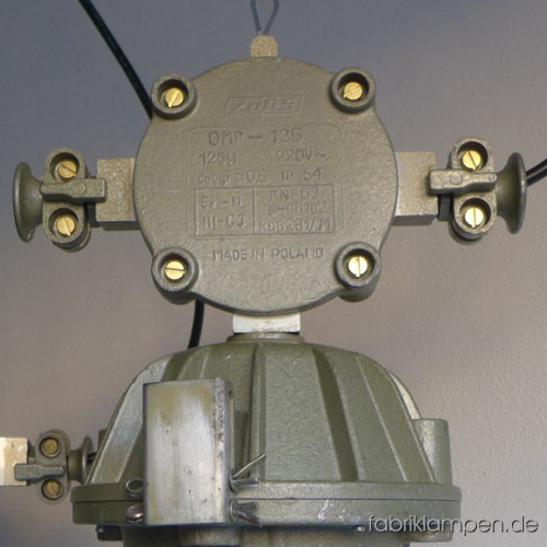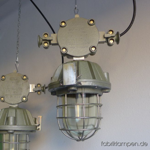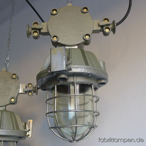 Die Industrieleuchten sind gereinigt und neu elektrifiziert (mit E27 Fassung). Material: Aluminium Oberteil, Schutzgitter aus Stahl, Schutzglas (Thermoglas). Sie bekommen diese Fabriklampen mit Aufhängeöse und 2 Meter Kabel geliefert (andere Längen sind natürlich möglich), auf Wunsch können die Leuchten mit Ketten-Aufhängung ausgestattet werden (gegen Aufpreis).