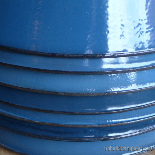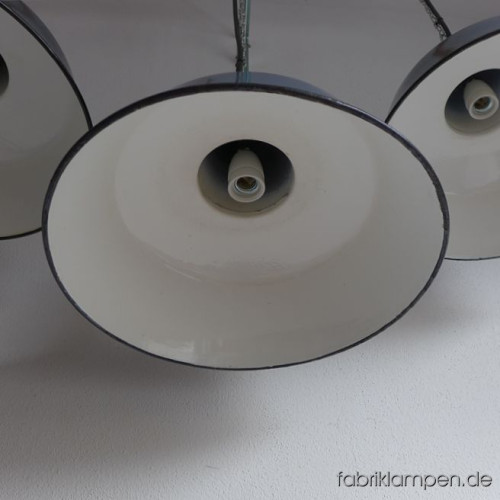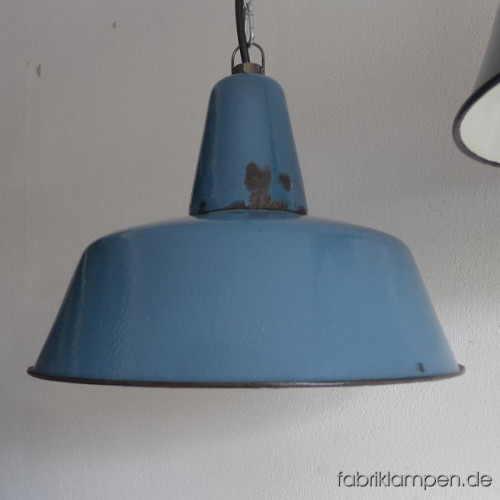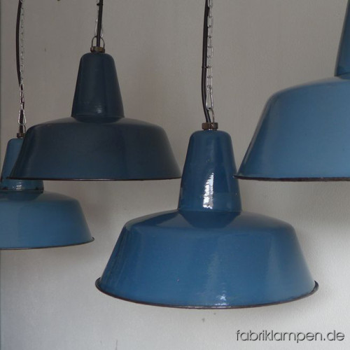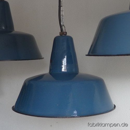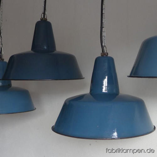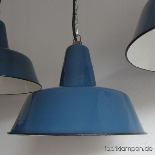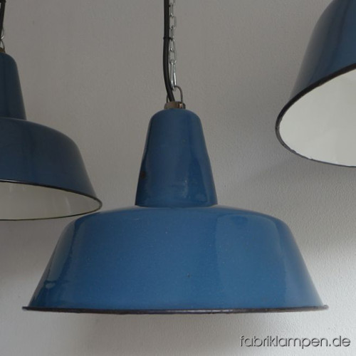 Sehr seltene alte blaue Industrielampen in verschiedenen Farbtönen. Material: blau (innen weiß) emailliertes Stahlblech. Diese alten Emaille Lampen existieren in verschiedenen Blautönen. Für die Bilder haben wir bewusst Leuchten in verschieden Farbtönen ausgesucht. Für größere Bestellungen können wir farblich passende Leuchten aussuchen.