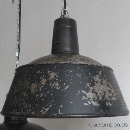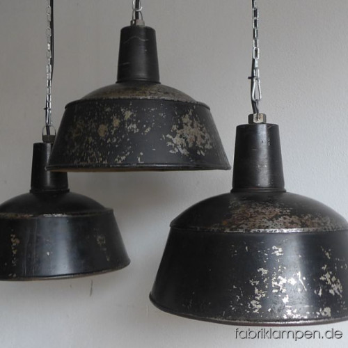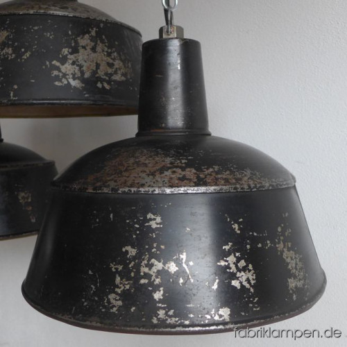 Alte, rare schwarze Industrielampen mit ausgeprägten Gebrauchsspuren. Diese Lampen stammen aus den 1930-ern – 1940-ern Jahren. Man hat diese Fabrikleuchten damals lackiert, nicht emailliert – ein seltener Posten.