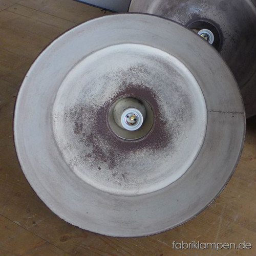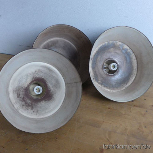 Diese alten Fabriklampen haben die massiven Spuren der vergangenen Jahrzehnte (Abplatzer, Roststellen, Kratzer, Verfärbungen und Co.). Sie sind gereinigt, konserviert und neu elektrifiziert, mit E27 Keramikfassungen.