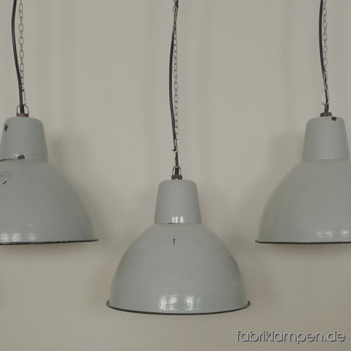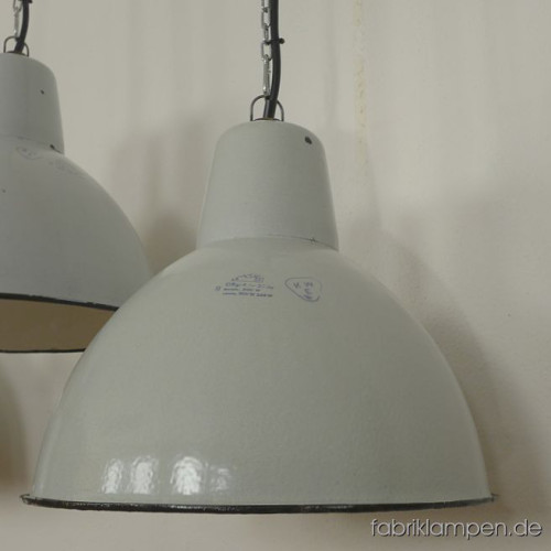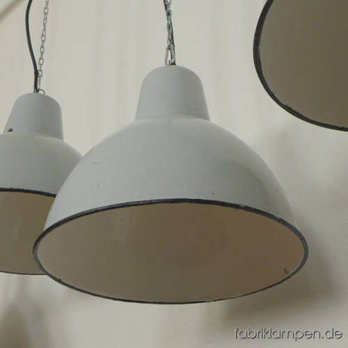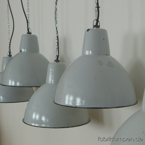 Material: hellgrau (innen weiß) emailliertes Stahlblech. Die Industrielampen werden mit Aufhängeöse und 2 Meter Kabel geliefert (andere Längen sind natürlich möglich), auf Wunsch können sie auch mit Textilkabel und Ketten- oder Stahlrohr-Aufhängung ausgestattet werden (gegen Aufpreis).