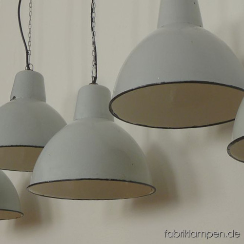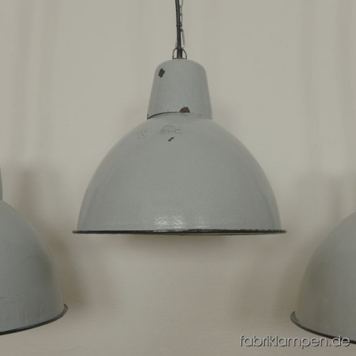 Alte hellgraue Industrielampe mit relativ hohem Schirm und dezenter Farbe.