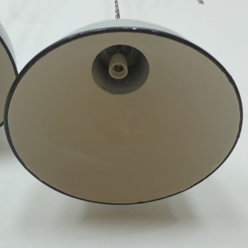 Diese schönen Fabriklampen haben die üblichen Spuren der vergangenen Jahrzehnte (Abplatzer, Roststellen, Kratzer, Verfärbungen und Co.). Sie sind gereinigt und neu elektrifiziert (E27 Keramikfassung).