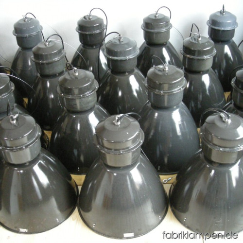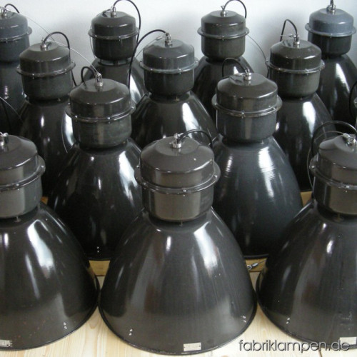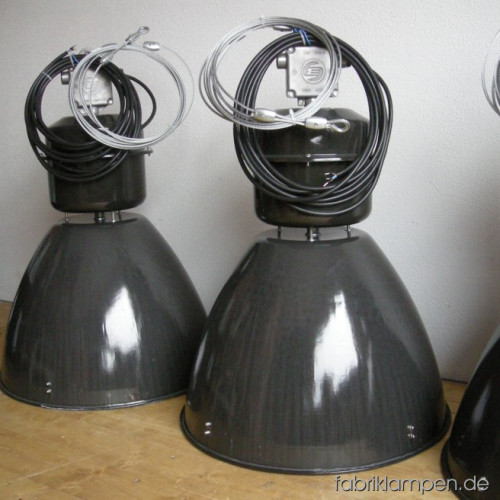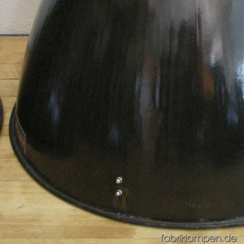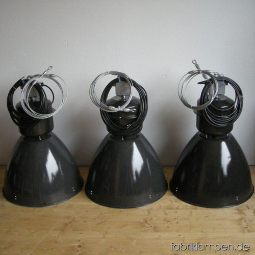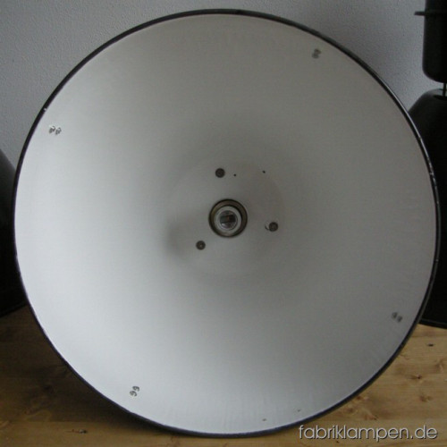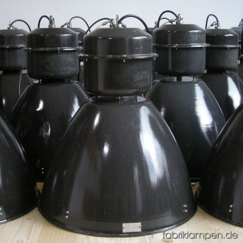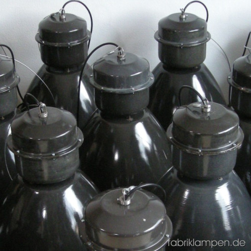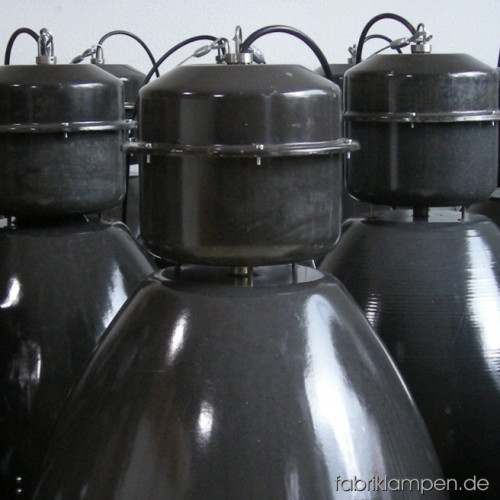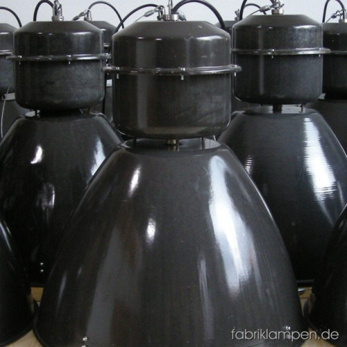 Große schwarze Emaille Industrielampen mit Oberteil. Material: schwarz (innen weiss) emailliertes Stahlblech, mit geringen Gebrauchsspuren. Die Lampen sind gereinigt, neu elektrifiziert und getestet – alle Leuchten haben eine E27 Porzellanfassung. Gesamthöhe: ca. 62 cm, Durchmesser Schirm ca. 53 cm.