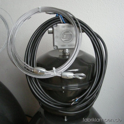 Aufhängung: Die Lampen werden mit Aufhängeöse, ohne Aufhängung geliefert. Bitte sorgen Sie für die geeignete Aufhängung der Lampen – die Leuchten mit Kabel zu heben oder aufzuhängen ist unzulässig. Gegen Aufpreis kann eine Ketten-Aufhängung – verzinkt, 2 Meter, oben und unten mit Karabinern, ohne Baldachin – mitgeliefert werden.