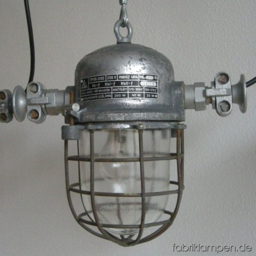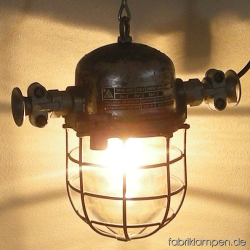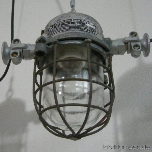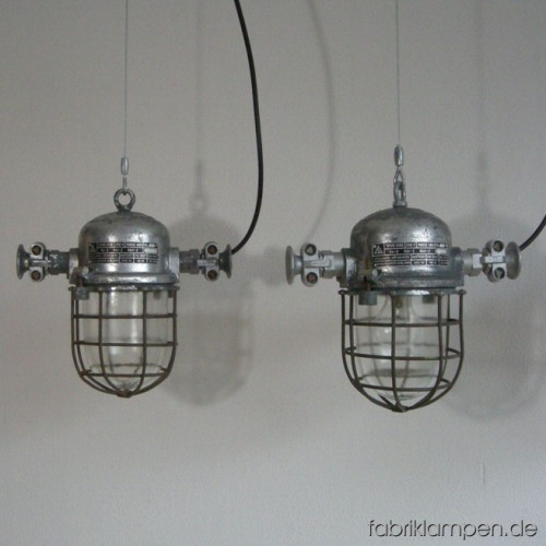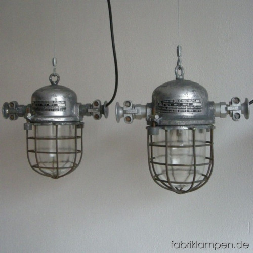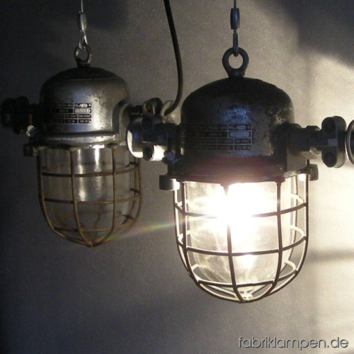 Klassische Bunkerlampe (Industrielampe) mit Aluminiumgehäuse, Stahlgitter und Schutzglas. Mit schönen Gebrauchsspuren. Die Lampen sind gereinigt, neu elektrifiziert (ausgestattet mit 2 m Kabel, Kabelfarbe rotbraun) und getestet. Gesamthöhe: ca. 30 cm, Durchmesser ohne Ohren ca. 18 cm. Auch in kürzerer Version auf Lager.