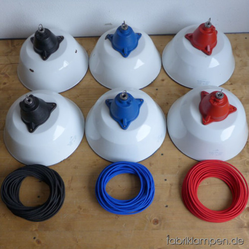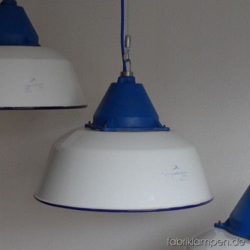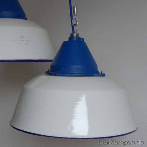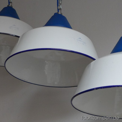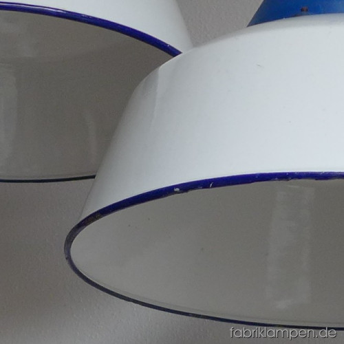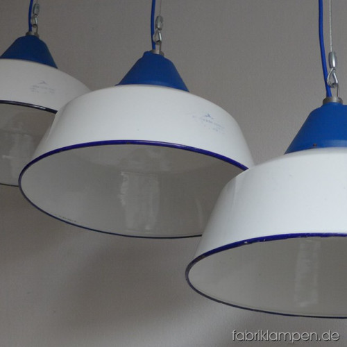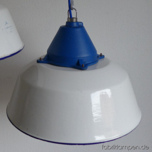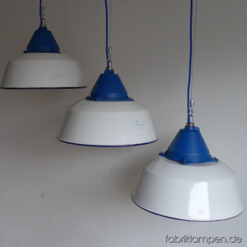 Große weisse Industrielampen mit blauen gusseisernen Oberteilen. Material: weiss emaillertes Blech mit blauer Umrandung unten (selten), gusseisernes Oberteil (blau lackiert). Die Lampen haben die Spuren der vergangenen Jarhzehnten (Verfärbungen, Abplatzer, Roststellen etc., besonders an Rändern und bei den Schraubenlöchern in den Schirmen) wie es auch sein soll. Sie sind gereinigt und neu elektrifiziert. Die Lampen haben neue E27-Fassungen und sind mit allen gängigen Leuchtmitteln einsatzbar (incl. LED- und Energiespar-Birnen). Alle Lampen werden mit 2 Meter blauem Textilkabel geliefert, andere Längen und Farben sind auch möglich. Die Maßen: Durchmesser ca. 41 cm, Höhe ca. 28 cm (ohne Aufhängeöse). Die Lampen können auf Wunsch auch mit Stahlrohr-Aufhängung und Baldachin geliefert werden (gegen Aufpreis). Andere RAL-Farben mit passendem Textilkabel sind auf Kundenwunsch auch möglich (s. letztes Bild unten, hier mit der kleineren Version dieser Lampen – Durchmesser 36 cm).