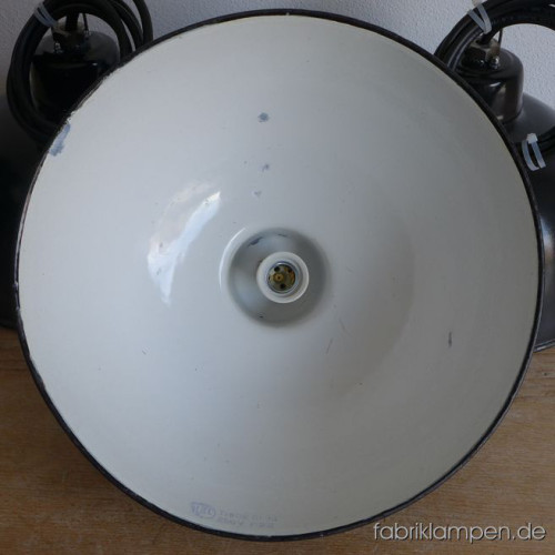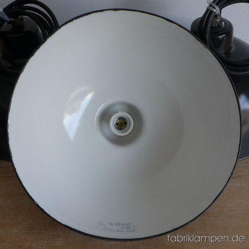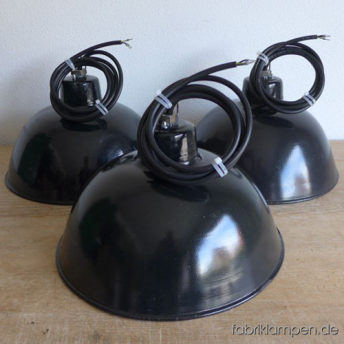 Alte kleinere schwarze Emaille LBL Fabriklampe (VEB Leuchtenbau Leipzig). Ein Posten von 4 Emaillelampen mit zeitloser Form. Die Lampen haben die deutlichen Spuren der vergangenen Jahrzehnte (kleine Abplatzer, Roststellen, Kratzer, Verfärbungen and Co. – wir haben die alle behandelt). Sie sind gereinigt und neu elektrifiziert (E27 Keramikfassung). Material: schwarz (innen weiß) emailliertes Stahlblech. Höhe der Lampen ca. 22 cm (ohne Öse), Durchmesser ca. 38 cm. Die Lampen werden mit Aufhängeöse und 2 Meter Kabel geliefert (andere Längen sind natürlich möglich), auf Wunsch können sie auch mit Textilkabel und Ketten- oder Stahlrohr-Aufhängung ausgestattet werden (gegen Aufpreis).