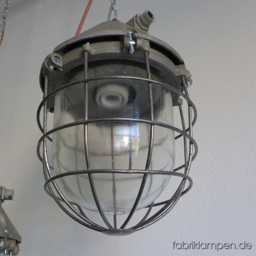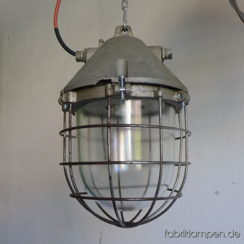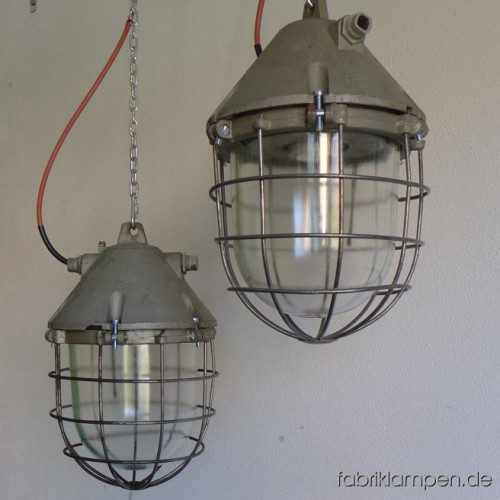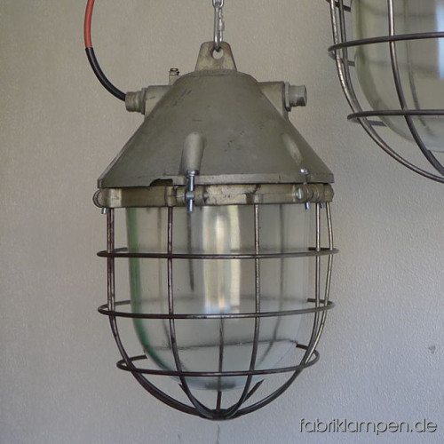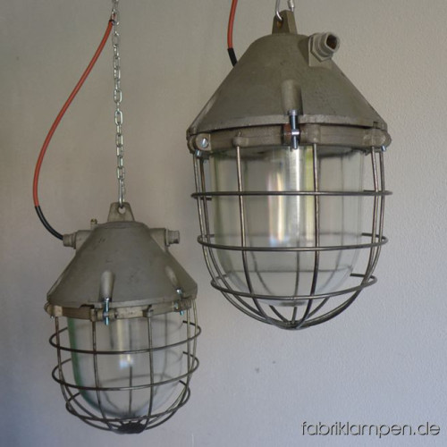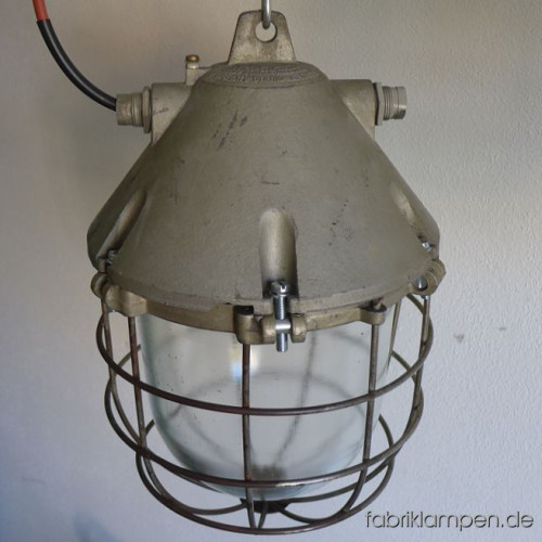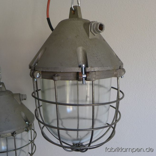 Big aluminium bunker lamps. Material: pale gray varnished casing, safety glass and grid. Cleaned, preserved, newly electrified, with E40/E27 or with E27 sockets. We have 35 pieces on stock. Height of the lamps ca. 42 cm (16,5 inches), diameter of the lamps ca. 30 cm (11,8 inches), weight ca. 7,3 kgs, the lamps are relatively light.